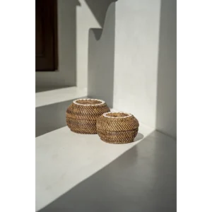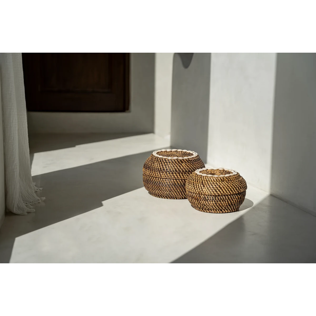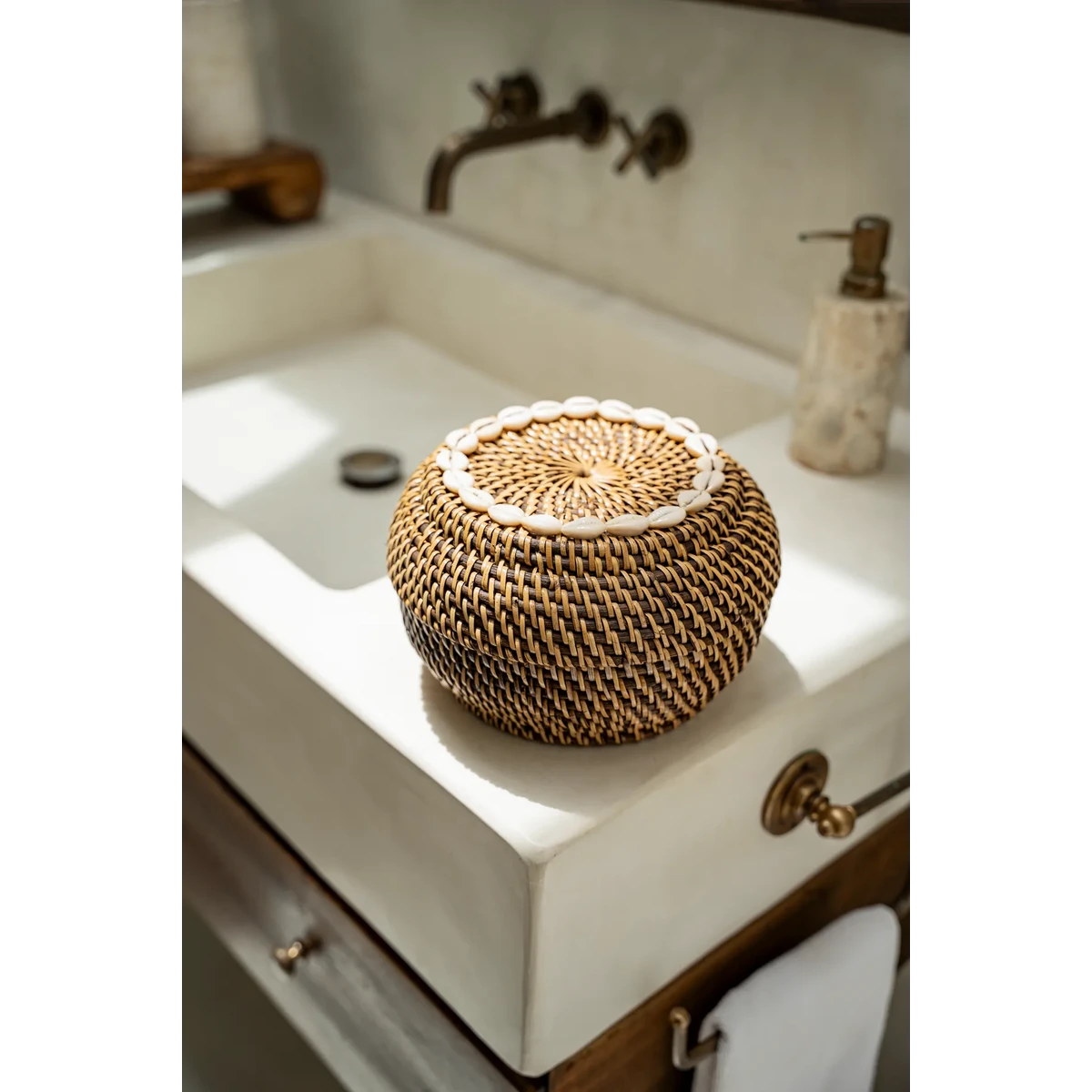 Deze schattige opbergmand, gemaakt van donkergekleurd rotan en verfraaid met kaurischelpen, is verkrijgbaar in twee maten en is de perfecte aanvulling op je huis! Gebruik hem voor het opbergen van sieraden, badkamerartikelen of zelfs koffiecapsules in je keuken – de mogelijkheden zijn eindeloos. Deze werken geweldig als set, maar zijn ook prachtig op zichzelf, jij beslist!