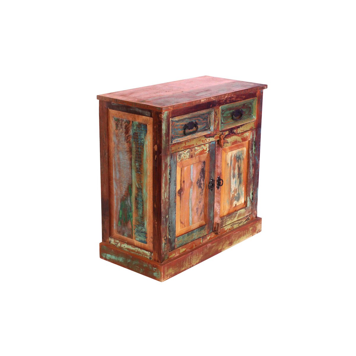 Deze ladekast van kleurrijk oud hout in shabby chic is een echte blikvanger. Dankzij de mogelijkheid om het te combineren met bestaand meubilair kan het op verschillende manieren worden gebruikt. De kast biedt voldoende ruimte in 2 lades en achter 2 ondoorzichtige deuren met elk een vaste plank voor de privéspullen van het leven. De afdekplaat is ook geschikt voor grotere vazen of schalen. In de gang als extra kledingkast biedt deze veel opbergruimte. Het hout van gerecyclede vissersboten geeft de ladekast een extra uitstraling. De ladekast kan gecombineerd worden met moderne meubels in een woon- of eetkamer of kan zijn charme in een hal tot uitdrukking brengen als halkast. Verre van onze vaak saaie perfectie, is dit meubelstuk werkelijk uniek. Gemaakt van FSC-gecertificeerd hout. 1 verdieping