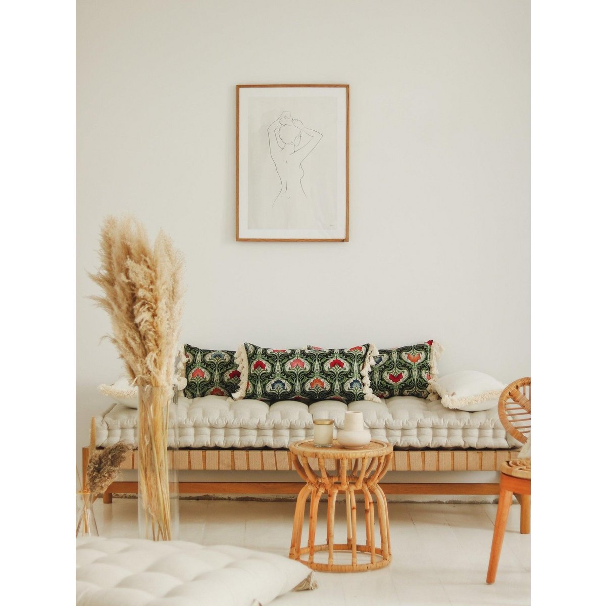 Reizen door cultureel kleurrijke plaatsen, met verbluffende architectuur en een palet van kleuren en geuren die bij elke stap opvallen kan eeuwig doorgaan! Maar als je even wilt uitrusten of een dutje wilt doen, kun je dat het beste doen op een zacht, knus kussen… Sierkussens zijn mooi, zeer comfortabel en praktisch. Ze vormen een mooie decoratie van de woon- of slaapkamer, waardoor ze uiterst gezellig zijn en perfecte omstandigheden creëren voor een dutje. Collectie “Boho tribe” De mozaïekcollectie “Boho tribe” is samengesteld uit rijke tapijtpatronen en warme kleuren van zacht fluweel, die de sfeer oproepen van zonnige middagen, zandgebieden van het hete zuiden en reizen door kleurrijke plaatsen. Kussens en kussens met franjes en kussens met hun namen doen denken aan Mediterrane steden, bloemrozetten en de zomerbries. Fluwelen kussens en bolsters met een lint met franjes, zeer zacht en aangenaam om aan te raken, zullen elke plek bedekken met hun pasteltinten. Wij moedigen u aan om unieke mozaïekkussensets in drie maten te maken. Kussens zijn gevuld met hoogwaardige anti-allergische siliconenvezelbolletjes. Je kunt ze veilig wassen in de wasmachine, de vulling blijft luchtig en elastisch. Stof: 43% katoen, 57% polyester. Afmetingen: 60 cm x 30 cm. Wastemperatuur: tot 30°C.