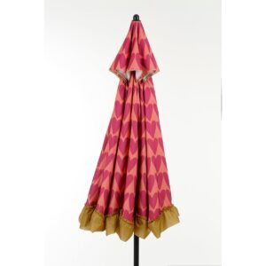 Met de roze Heart parasol voeg je een vleugje vrolijkheid toe aan elke zomerse dag. Het opvallende design van de Heart Parasol Roze met hartjesprint en speelse bruine ruches maken deze Heart parasol een echte blikvanger in de tuin of op het strand. Dankzij de meegeleverde hoes, die je ook als draagtas kunt gebruiken, is de Heart parasol beschermd als je hem niet gebruikt en neem je hem eenvoudig overal mee naartoe. De stevige parasolstok en het polyester materiaal zorgen voor stabiliteit en bescherming tegen de zon. De lente en zomer kom je goed door met deze parasol! De afmetingen zijn H238 x Ø220 cm.