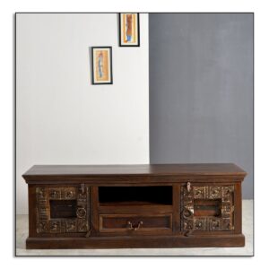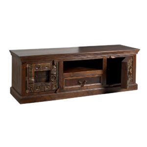 Een lowboard dat je het gevoel geeft op vakantie te zijn in India. Uitgebreid snijwerk op gerecycled oud hout met metalen applicaties geven de voorkant van het tv-meubel de antieke koloniale uitstraling die typerend is voor India. De handgemaakte kast biedt voldoende opbergruimte achter 2 deuren, 1 open vak en een lade voor dvd-spelers, gameconsoles, ontvangers, versterkers, afstandsbedieningen enz. De tv-ladekast kan met passende accessoires prachtig tentoon worden gesteld en laat de schoonheid van het antieke koloniale De multimedia ladekast komt goed tot zijn recht. Opzettelijke gebruikssporen geven de ladekast een extra uitstraling. De ladekast kan in een woonkamer worden gecombineerd met moderne meubels en woonruimtes en geeft uitdrukking aan zijn charme. Vakmaat 50x40x11 cm, lade binnenmaat 47x33x10 cm, 1 vaste plank achter de deuren, vakmaat BT 42,5×37, hoogte boven 16 cm en onder 13 cm, laderails van hout