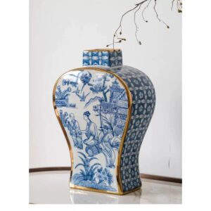 Dit is een goud-vormige hoge porseleinen vaas, bekend als de Oosterse Parijse Delfts blauwe vaas, die traditionele oosterse esthetiek combineert met moderne Chinese stijl.