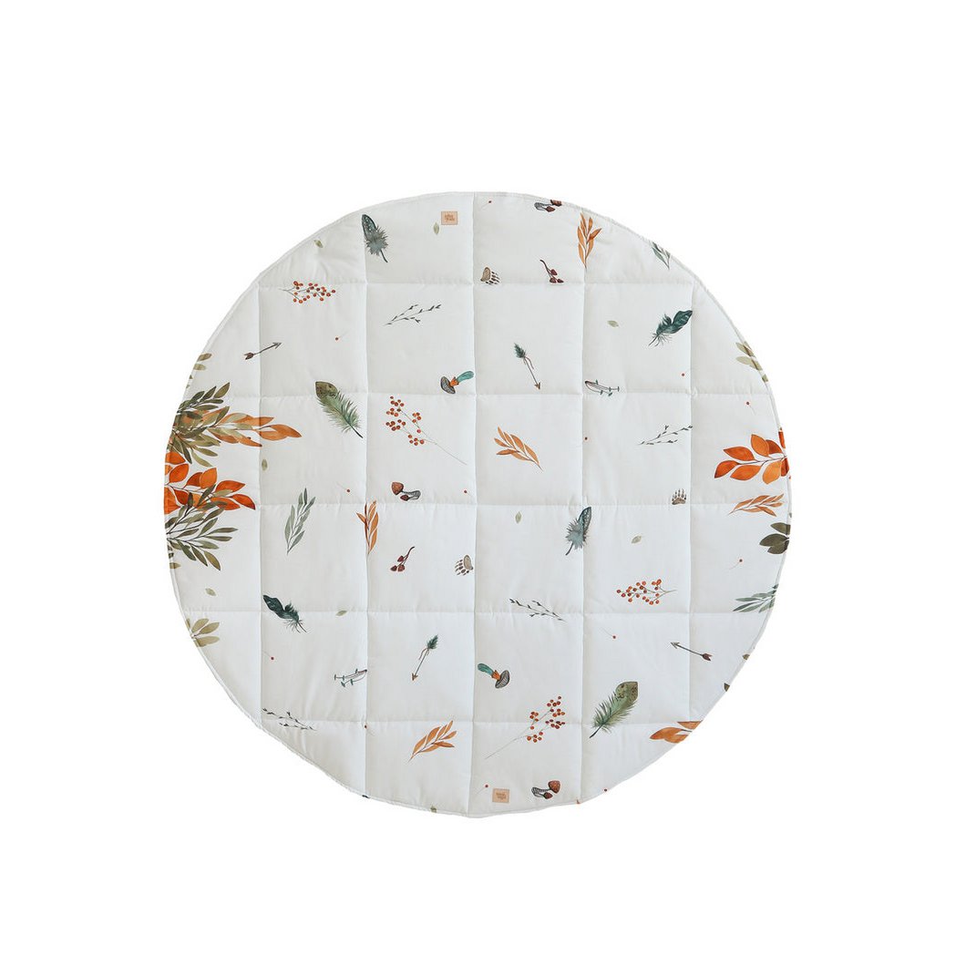 Na een lange reis door het bos is het tijd om even te pauzeren op een prachtige open plek. Een comfortabele mat maakt deel uit van de inventaris van elke avonturier; hij is ook handig tijdens lange gesprekjes in tipi’s, en komt goed van pas als boot bij het oversteken van rivieren. De gewatteerde mat doet dienst als heerlijk comfortabel vloerkleed in een kinder kamer en kan dienen als aanvulling op een tent, overkapping of wanddecoratie . Het kan ook in de tuin of bij een picknick worden gebruikt. En het beste is om er al vanaf jonge leeftijd op te rollen en met speelgoed te spelen! De mat maakt deel uit van onze collectie, geboren uit liefde voor wandelen in het bos en slapen in een tent in de vrije natuur. De tipi introduceert een unieke sfeer in de kinder kamer. In de collectie vindt u ook kussens en slingers. De zachte katoenen gewatteerde mat is perfect als klein kleedje bij het kinderbedje, als speelkleed voor uw kind of als onderdeel van de tipi-set. Duurzaam, dubbelzijdig, gevuld met dikke isolatievoering. Stof: 100% OEKO-TEX® gecertificeerd katoen. Wastemperatuur: tot 30°C. Afmeting: 120×120 cm +- 3 cm, dikte: 3 cm.