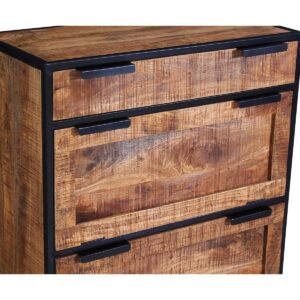 Deze schoenenkast van naturelkleurig mangohout met een trendy zwart sledeframe zorgt voor orde in het leven van je schoenen. Achter twee kleppen voorzien van metalen handgrepen is er voldoende ruimte voor sportschoenen, sandalen, pantoffels, sneakers, kinderschoenen etc. De lade biedt extra ruimte voor schoenlepels, schoenveters, schoenverzorging etc. De materiaalmix van rustiek hout in een warme natuurtinten en glad metaal zijn helemaal trendy, zorgen voor interessante contrasten in uiterlijk en creëren een huiselijke sfeer. Voor ca. 12 paar schoenen.