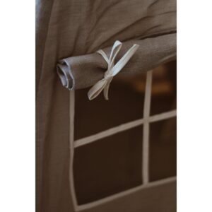 Je kleine avonturier kan urenlang de wereld verkennen en spelen, maar bij terugkomst heeft hij of zij een plek nodig om uit te rusten, te eten en plannen te maken voor verdere avonturen. Een tipi betekent letterlijk een woning, en is een woord dat wordt gebruikt door de Sioux, de inheemse bevolking van de Great Plains. Het is een ruimte voor allerlei soorten plezier. En het heeft een raam met een gordijn om de omgeving te bekijken! Als het spelen klaar is, kun je de tipi weer in de hoes inpakken en bijvoorbeeld in de hoek van de kamer opbergen. Opgevouwen neemt hij niet veel ruimte in beslag en dankzij de hoes neem je hem gemakkelijk mee naar buiten. Binnenin zit een vakje waarin kinderen hun speelgoed, boeken en andere schatten kunnen verstoppen. Een comfortabele mat maakt deel uit van de inventaris van elke avonturier; Ook is hij handig tijdens lange vergaderingen in tipi’s, en als bootje bij het oversteken van rivieren 🙂 De mat doet dienst als heerlijk comfortabel vloerkleed in een kinderkamer en kan dienen als aanvulling op een tent, overkapping of wanddecoratie. Het kan ook in de tuin of bij een picknick worden gebruikt. En het beste is om er al vanaf jonge leeftijd op te rollen en met speelgoed te spelen! 🙂 Dankzij de vijfwandige structuur is de linnen tent in natuurlijke stofkleur stabiel wanneer hij wordt opgezet, de palen zijn afgerond en geplaatst in tunnels die aan de onderkant aan elkaar zijn genaaid. De mat voegt een vleugje fantasie, gezelligheid en unieke charme toe aan elk interieur. De tipi is gemaakt van natuurlijke materialen: 100% linnen stof en grenen palen. De duurzame mat is gemaakt van hoogwaardig linnen en katoen. De set bestaat uit een speeltent, mat, stokken en een katoenen hoes. Vul het gerust aan met onze prachtige decoraties en accessoires. De bladmat is dubbelzijdig, gevuld met dikke isolatievoering. Tipi-stof: 100% OEKO-TEX®-gecertificeerd linnen. Grenenpalen: 180 cm. Hoogte opgebouwd: 170 cm. Diameter onderkant: 120/130 cm. Stof bladmat: 100% linnen, 100% katoen OEKO-TEX® gecertificeerd. Afmeting: 120 x 110 cm +- 3 cm; dikte: 3 cm. Wastemperatuur voor de mat en tipi: tot 30°C.
