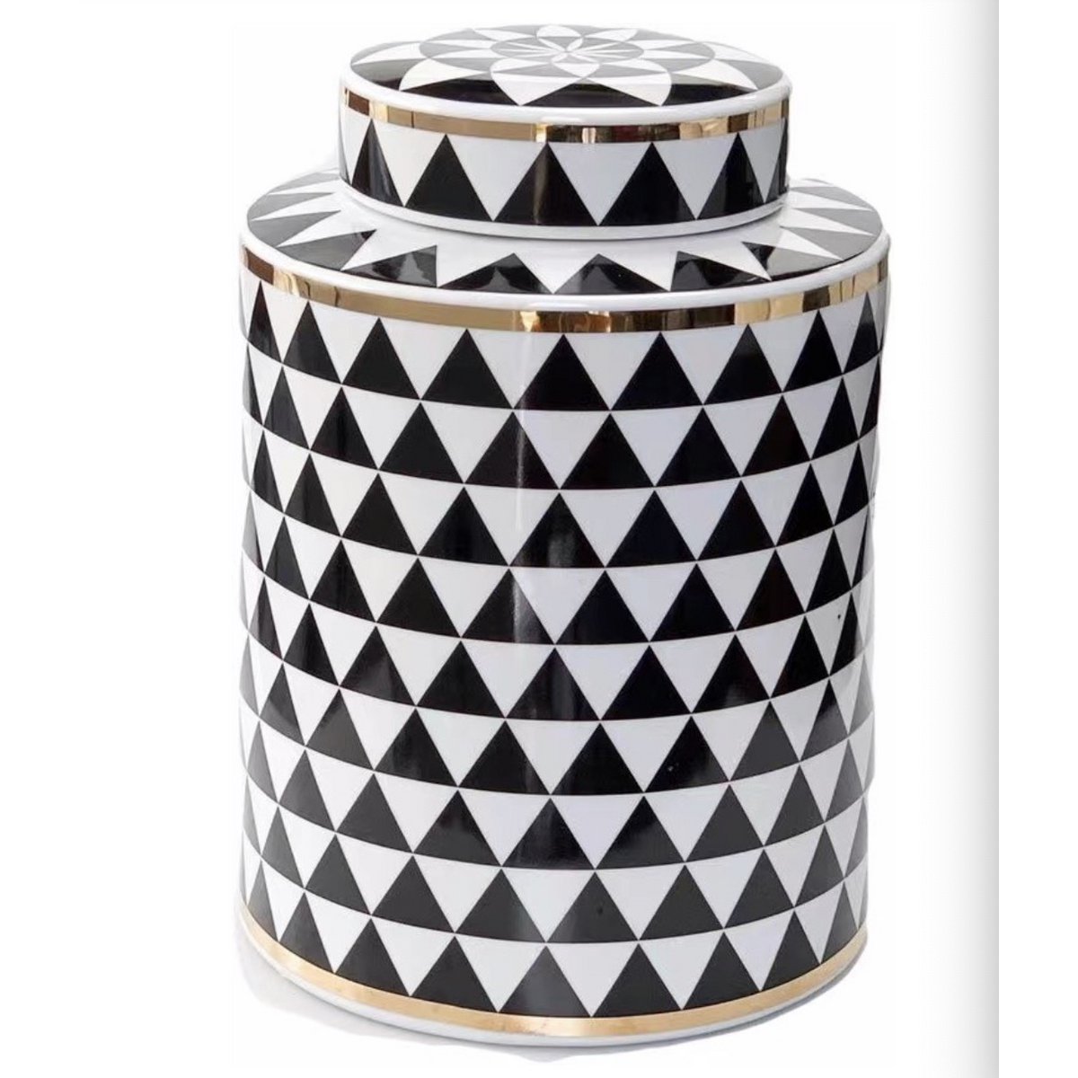 Voorraadpot met deksel en gouden randen, unieke combinatie die niet zal misstaan in een modern of traditioneel interieur. Hij is prachtig afgewerkt, de zwarte driehoeken maken deze voorraadpot uniek. Hij is verkrijgbaar in 2 verschillende maten, dit is de grotere versie.